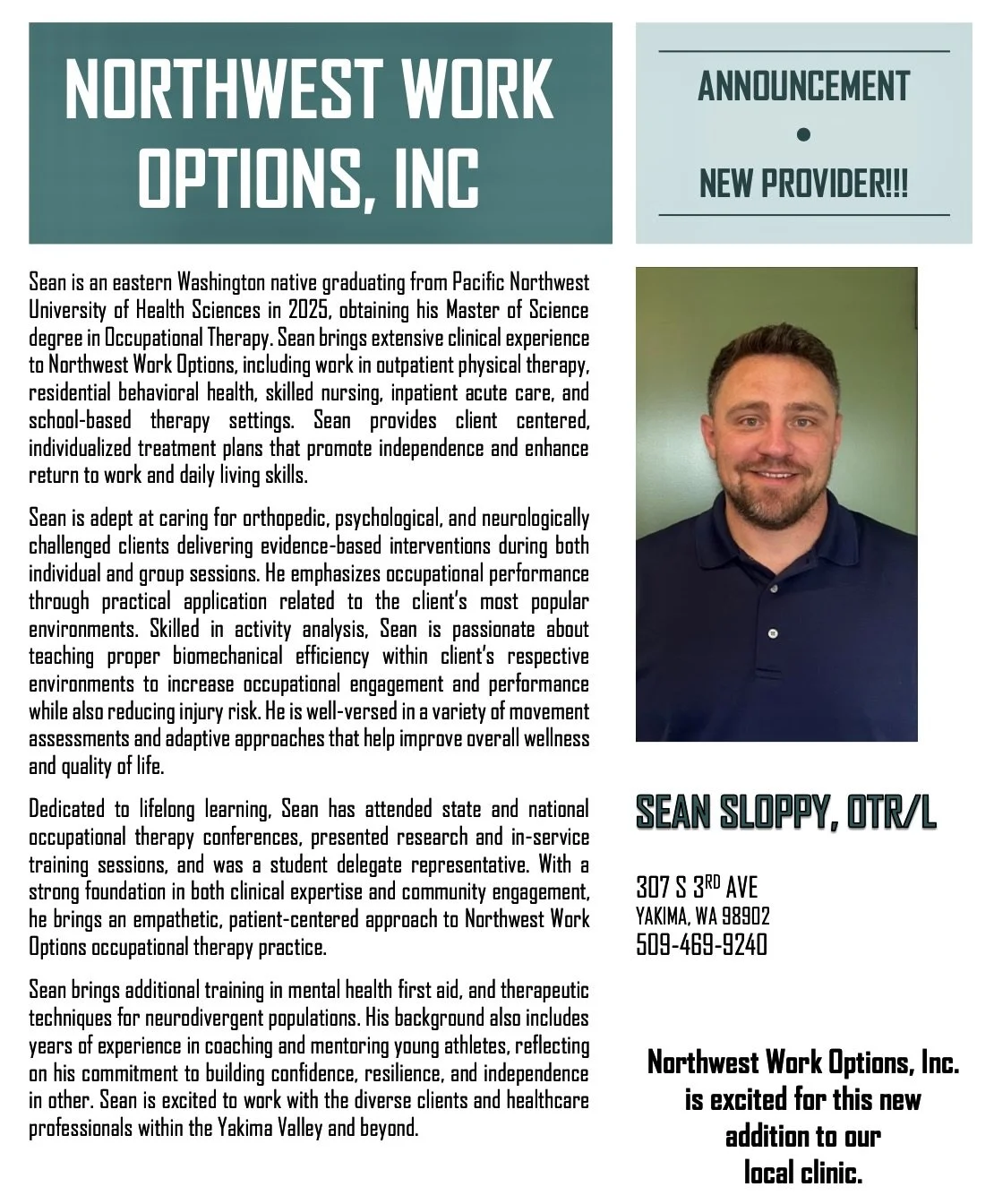 JONATHAN HARRISON IS A LEADING OCCUPATIONAL THERAPIST WITH OVER 20 YEARS OF PROGRESSIVE THERAPY EXPERIENCE. AS THE OWNER OF NORTHWEST WORK OPTIONS, INC., JONATHAN HAS SUCCESSFULLY COMPLETED HIS 16TH YEAR OF PROVIDING EXEMPLARY WORK INJURY SERVICES AT HIS PRIMARY LOCATION IN YAKIMA. AS OCCUPATIONAL THERAPISTS GO, JONATHAN HAS SOUGHT CONTINUING EDUCATION OPPORTUNITIES THAT WILL HELP HIM STAY AHEAD OF THE PACK. HE IS A MATHESON CERTIFIED CONTENT EXPERT WHOSE LISTS OF SERVICES INCLUDE: